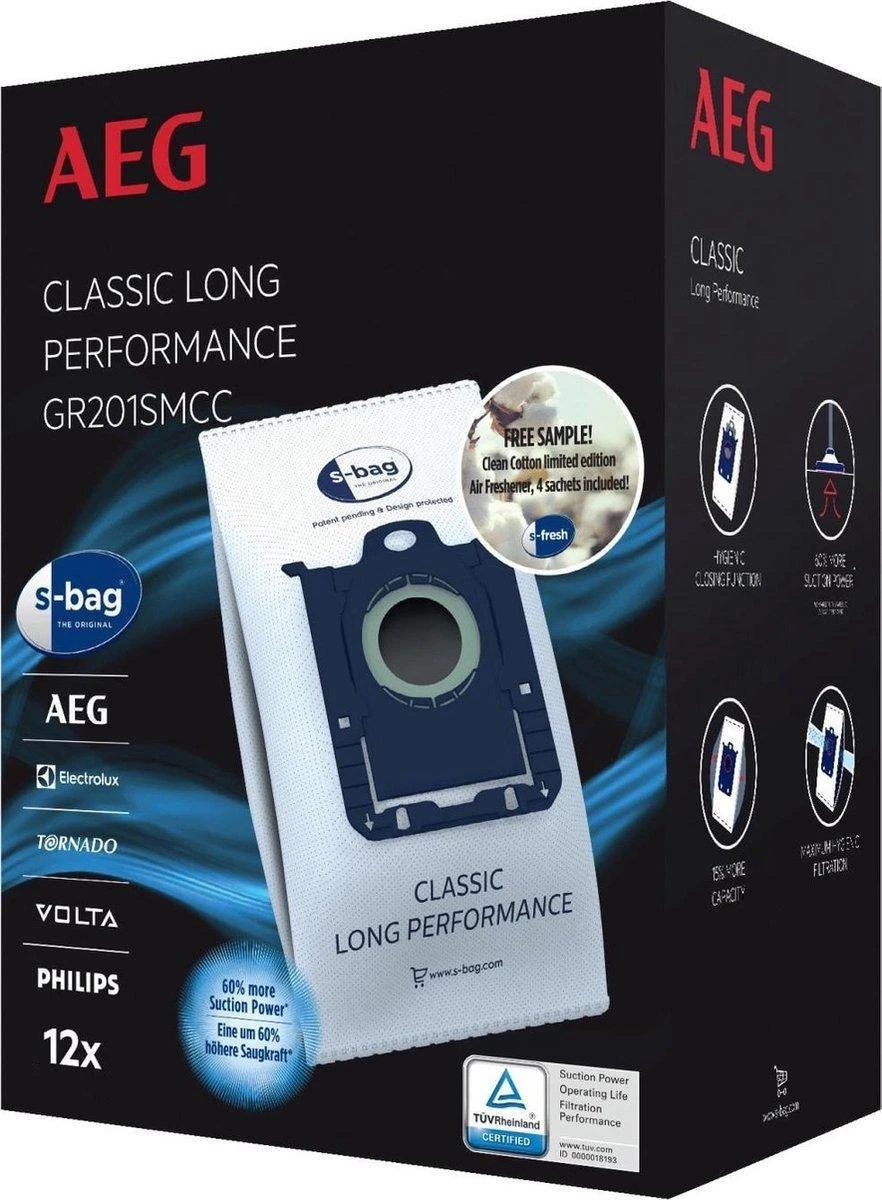 Met de AEG GR201SMCC S-Bag (12 stuks) haal je naast een voorraad stofzuigerzakken, ook gelijk een nieuw setje stofzuigerverfrissers in huis. Als je elke 3 maanden de stofzuigerzak vervangt, heb je met dit pakket genoeg stofzuigerzakken voor 3 jaar. Wil je dat de uitblaaslucht van de stofzuiger gelijk een aangename geur in de woonkamer achterlaat? Zuig dan de meegeleverde geurstaafjes op. Is niet alleen de vloer stofvrij, maar ruikt het hele huis lekker fris. De stofzuigerzakken zijn geschikt voor alle S-bag AEG en Philips stofzuigers met zak.