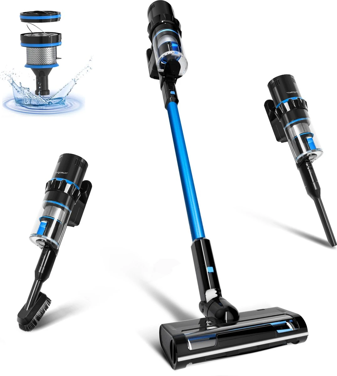 De steelstofzuiger heeft 3 zuigmodi, bedrijfstijd (laag/standaard/hoog): ca. 41 min/22 min/12 min, waardoor snel stof en deeltjes worden verwijderd. Het 5-traps verzegelde filtersysteem kan het afval in de afvalcontainer stevig blokkeren, of het nu gaat om groot afval of klein stof, waardoor secundaire vervuiling effectief en veilig wordt voorkomen. De stofbak van de draadloze steelstofzuiger kan tot 0,5 liter vuil verwerken, waardoor hij groot genoeg is om overmatige reiniging keer op keer te voorkomen. Leeg de stofbak met één klik. Eenvoudig schoonmaken zonder uw handen erbij vuil te maken. Met multifunctionele hulpborstels en een enorme zuigkracht werkt de draadloze steelstofzuiger perfect op elk type vloer (inclusief tapijten en harde vloeren) zonder krassen en schade achter te laten.