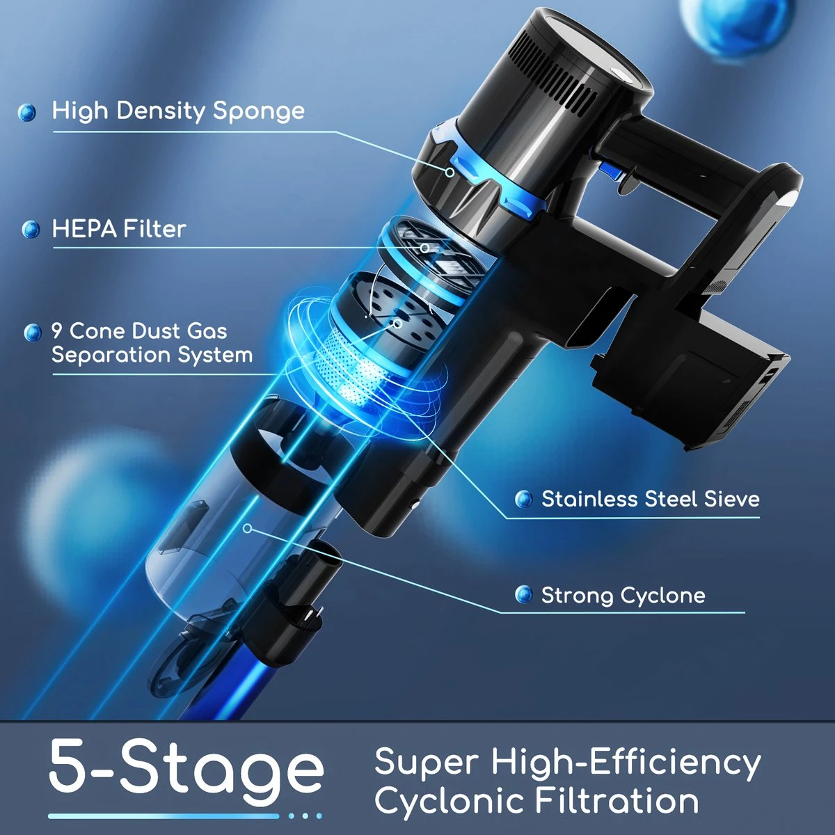 【5-traps hoogwaardig filtersysteem】Draadloze steelstofzuiger met het volledig gesloten cycloonfiltratiesysteem, de steelstofzuiger kan 99,98% van de fijne deeltjes zo klein als 0,1 micron opvangen en effectief vuil scheiden met sterke centrifugale kracht, waardoor elke gebruiker de ultieme luchtzuivering en reinigingservaring krijgt. Opmerking: Het filter is wasbaar en regelmatige reiniging van het filter voorkomt dat de zuigkracht afneemt en het filter verstopt raakt.