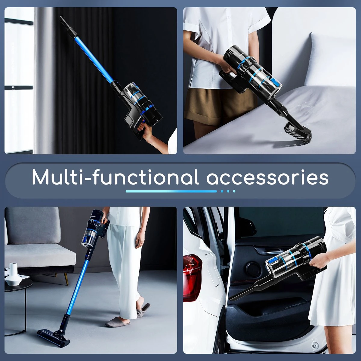 【4-in-1 stofzuiger】Deze krachtige draadloze steelstofzuiger is uitgerust met verschillende borstelkoppen om functies van zowel handstofzuigers als autostofzuigers mogelijk te maken. U kunt hem gebruiken om de vloer, het tapijt, de trap, de tafel, het autostoeltje of zelfs het toetsenbord te reinigen, enz. Deze steelstofzuiger met krachtige zuigkracht kan eenvoudig bediend met één knop.