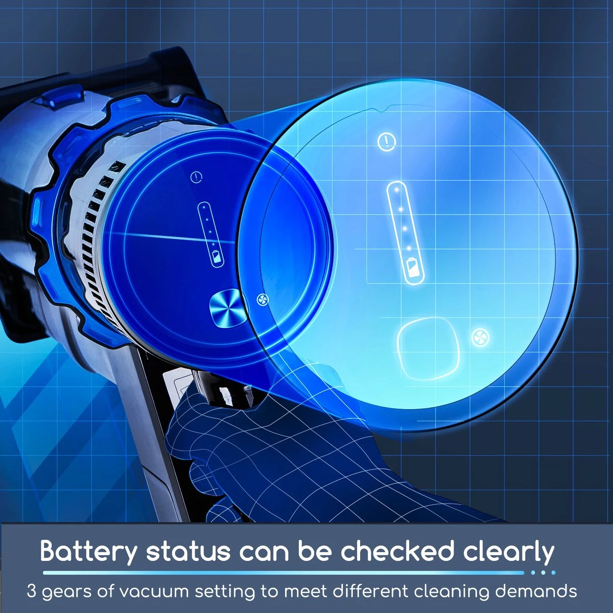 【22kPa krachtige zuigkracht】De draadloze Aigostar steelstofzuiger met een 250W borstelloze motor kan 22kPa krachtige zuigkracht bieden in maximale modus, wat ideaal is voor het reinigen van meerdere oppervlakken en het verwijderen van dierenhaar. De 3 verschillende standen voldoen niet alleen aan uw dagelijkse reinigingsbehoeften, maar maximaliseren ook de efficiëntie van de batterij.