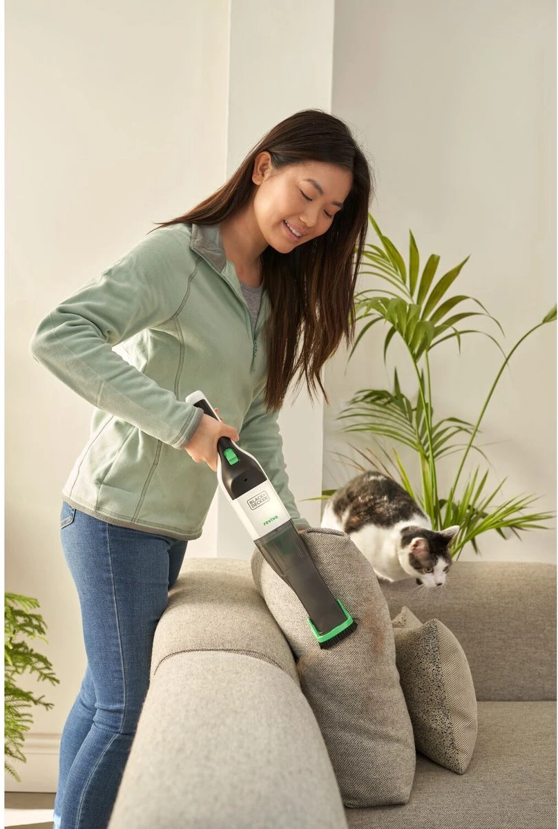 Deze 7.2V BLACK+DECKER Reviva Kruimeldief is een lichte en compacte oplossing voor alle schoonmaakklussen in huis. Zijn slanke design met geïntegreerde zachte borstel levert tot 11 minuten werktijd en de zuigkracht voor een ultieme vuilopname in één beweging. Dankzij het transparante ontwerp weet je steeds wanneer het nodig is het opvangreservoir te legen. Draai het reservoir los, verwijder de wasbare filter en leeg het zonder het vuil aan te raken. Deze kruimeldief maakt deel uit van het BLACK+DECKER Reviva assortiment, waarbij de behuizing gemaakt werd met Tritan™ Renew 50% gecertifieerd gerecycleerd materiaal* en deze behuizing een hoeveelheid gerecycleerd materiaal bevat, gelijk aan het gewicht van 15 0.5L plastic flessen**.
