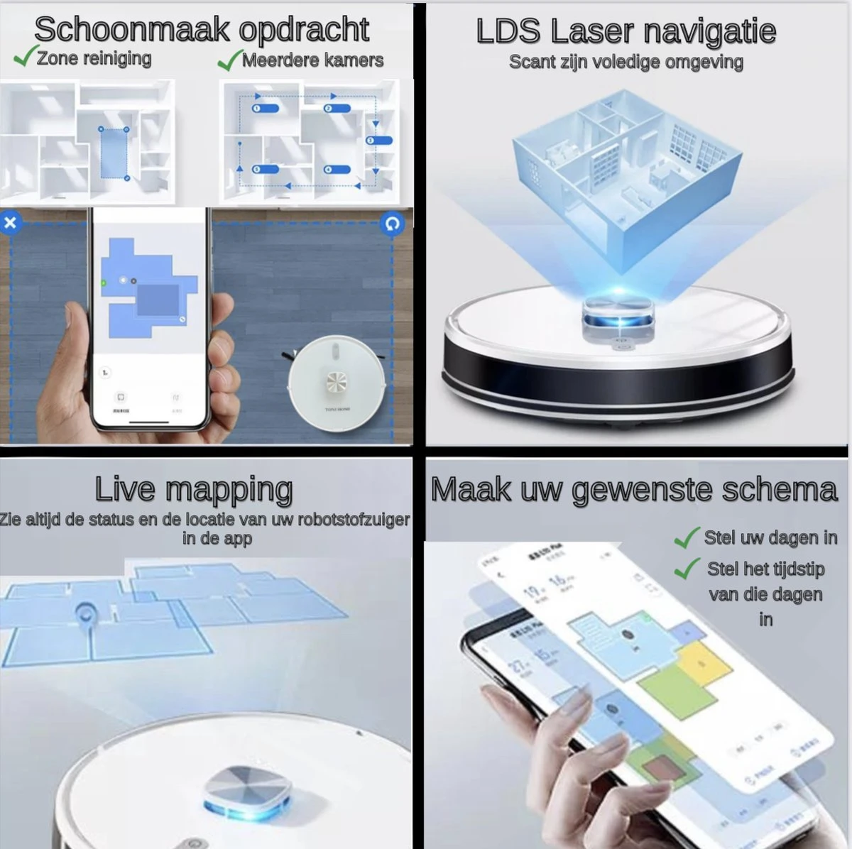 – De robotstofzuiger beschikt over een LDS laser navigatie systeem. Alleen de allerbeste robotstofzuigers hebben deze navigatie. Door deze navigatie heb je een paar extra unieke opties zoals, live mapping, teken een zone in de kaart die direct schoongemaakt moet worden, teken virtuele muren in de app, en je kan no-go zones aangeven. De robotstofzuiger werkt ook veel efficiënter dan andere robotstofzuigers zonder deze navigatie.